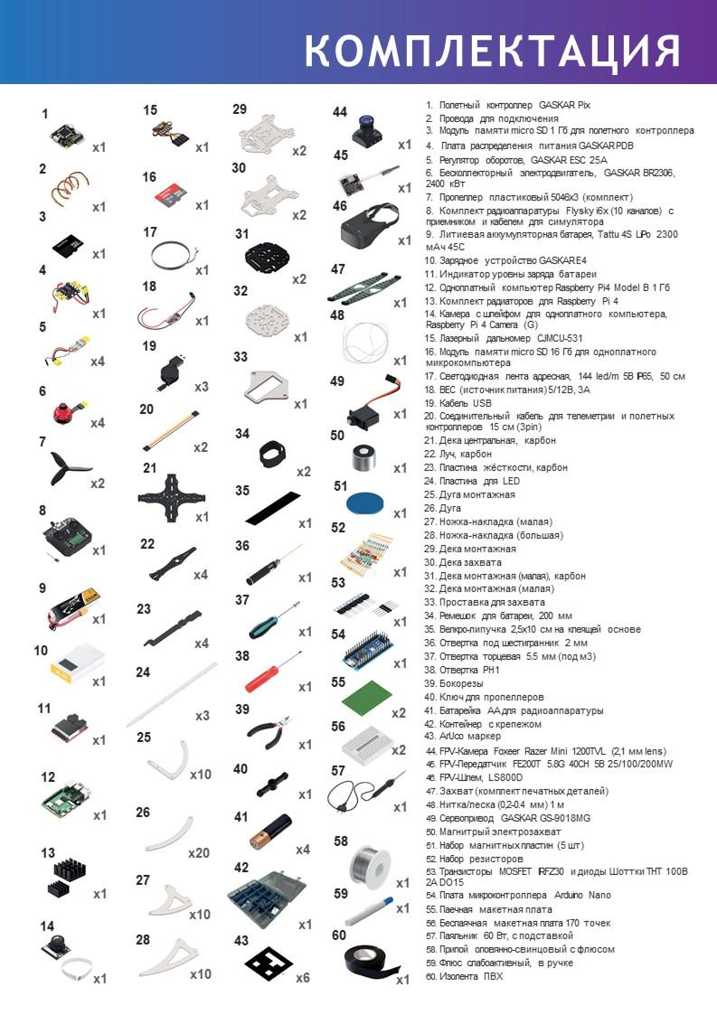 Конструктор программируемого квадрокоптера «Клевер Про» представляет собой комплексное решение для сборки, пайки, настройки и эксплуатации БАС. Комплект включает в себя все необходимые для этого компоненты: полный набор комплектующих для сборки квадрокоптера Клевер, специализированный инструментарий, включая пульт, FPV-очки, паяльное оборудование, лицензионное программное обеспечение, а также подробные методические материалы по сборке и запуску. Отсутствует необходимость в приобретении дополнительных деталей или компонентов, так как все требуемые элементы системы поставляются в рамках базовой конфигурации комплекта. Прилагаемые методические материалы обеспечивают стандартизированный и понятный процесс сборки устройства, его программирования и эксплуатации.